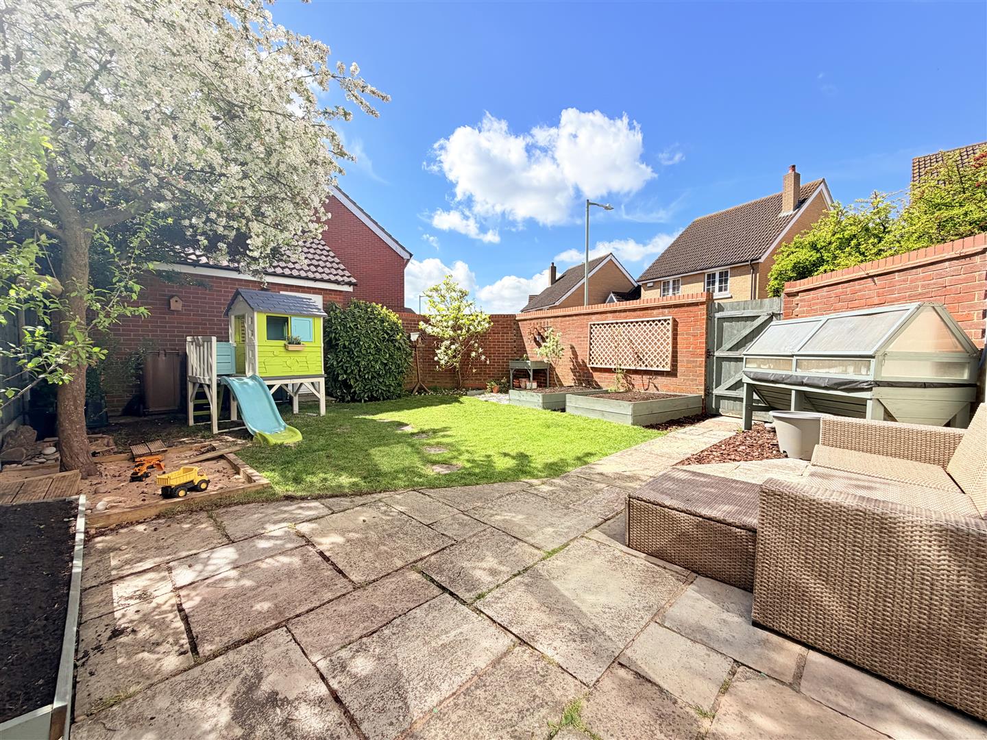 Occupying a desirable corner plot, the property benefits from gardens to the side, with shingled borders to the front and side and an external water tap. A gate provides access to the south-facing garden, which is enclosed by brick walling and fencing for privacy, and mainly laid to lawn with raised beds, borders, and a paved patio area. A driveway to the side provides off-road parking and leads to a larger-than-average detached garage measuring 5.44m (17'10") x 3.78m (12'5"), featuring an up-and-over door, power and lighting, eaves storage, and a personal side access door.