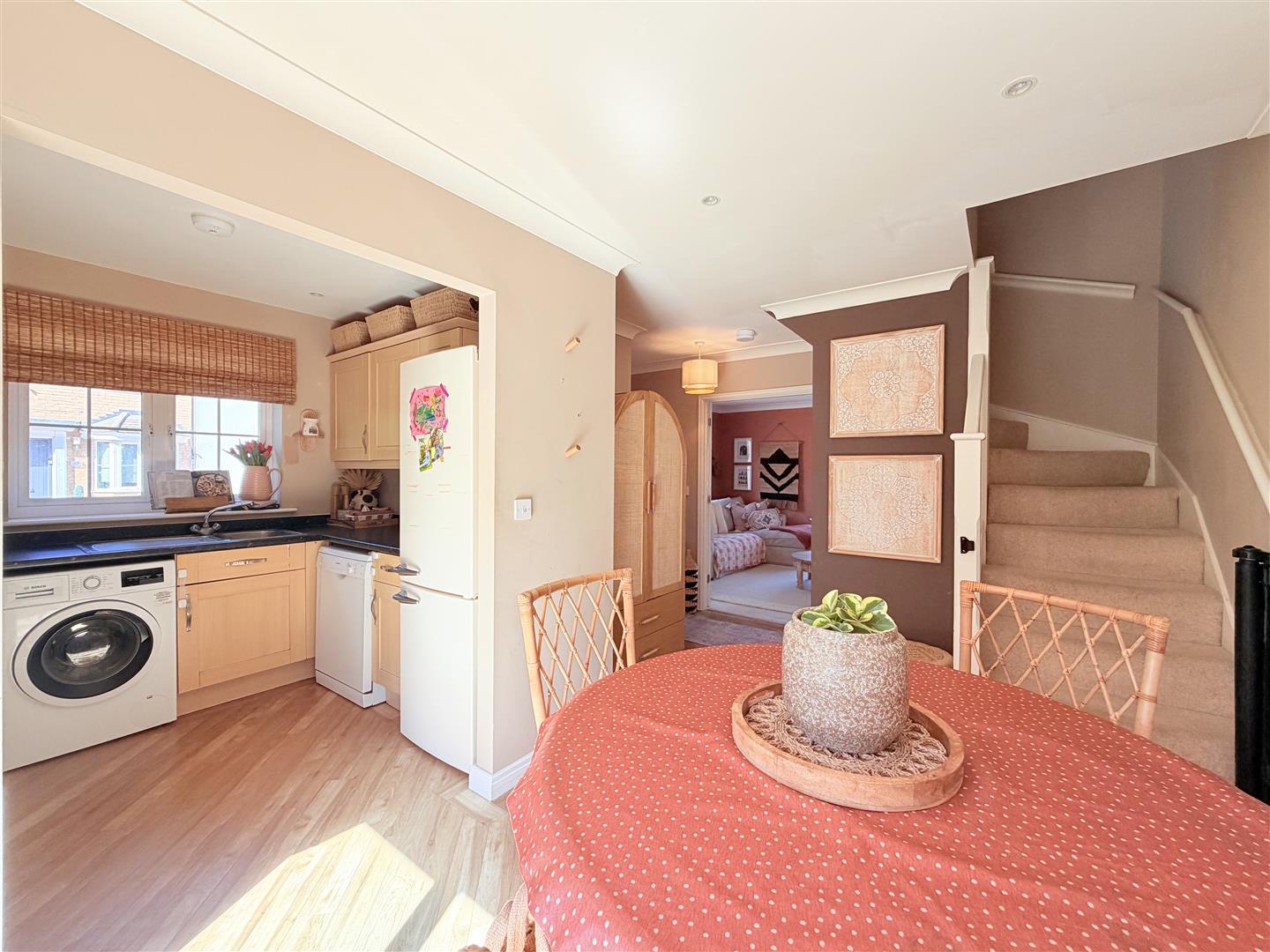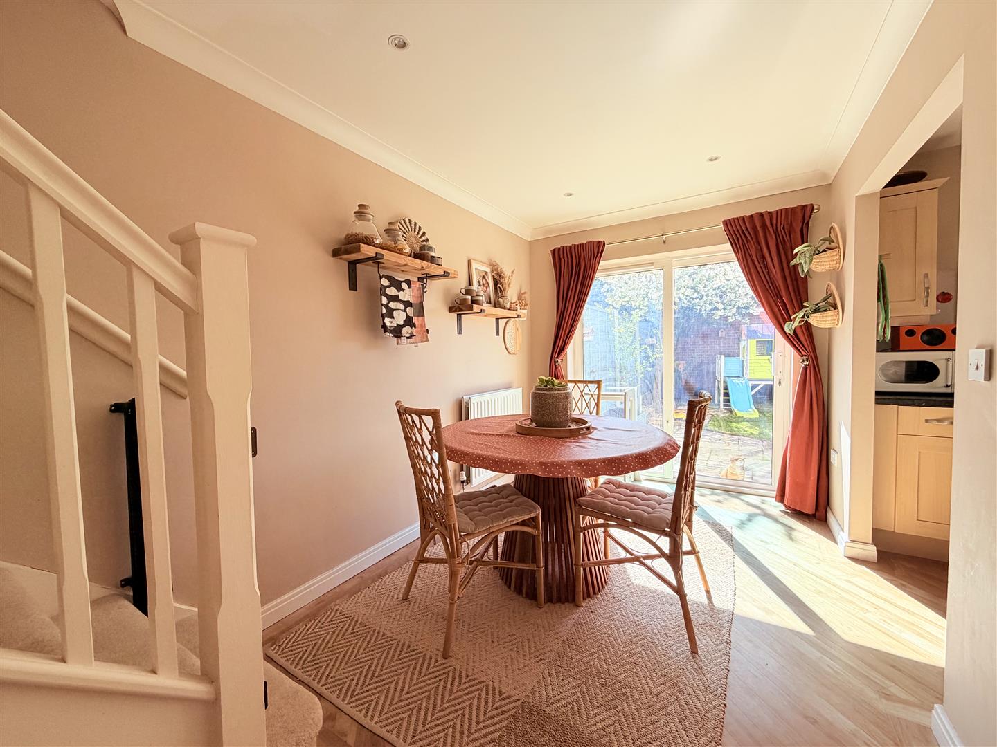 A versatile dining space with stairs rising to the first floor and a built-in understairs storage cupboard housing the consumer unit. Finished with wood-effect vinyl flooring, downlighting, radiator, and a UPVC sliding patio door opening onto the side garden. The room flows seamlessly into the kitchen.