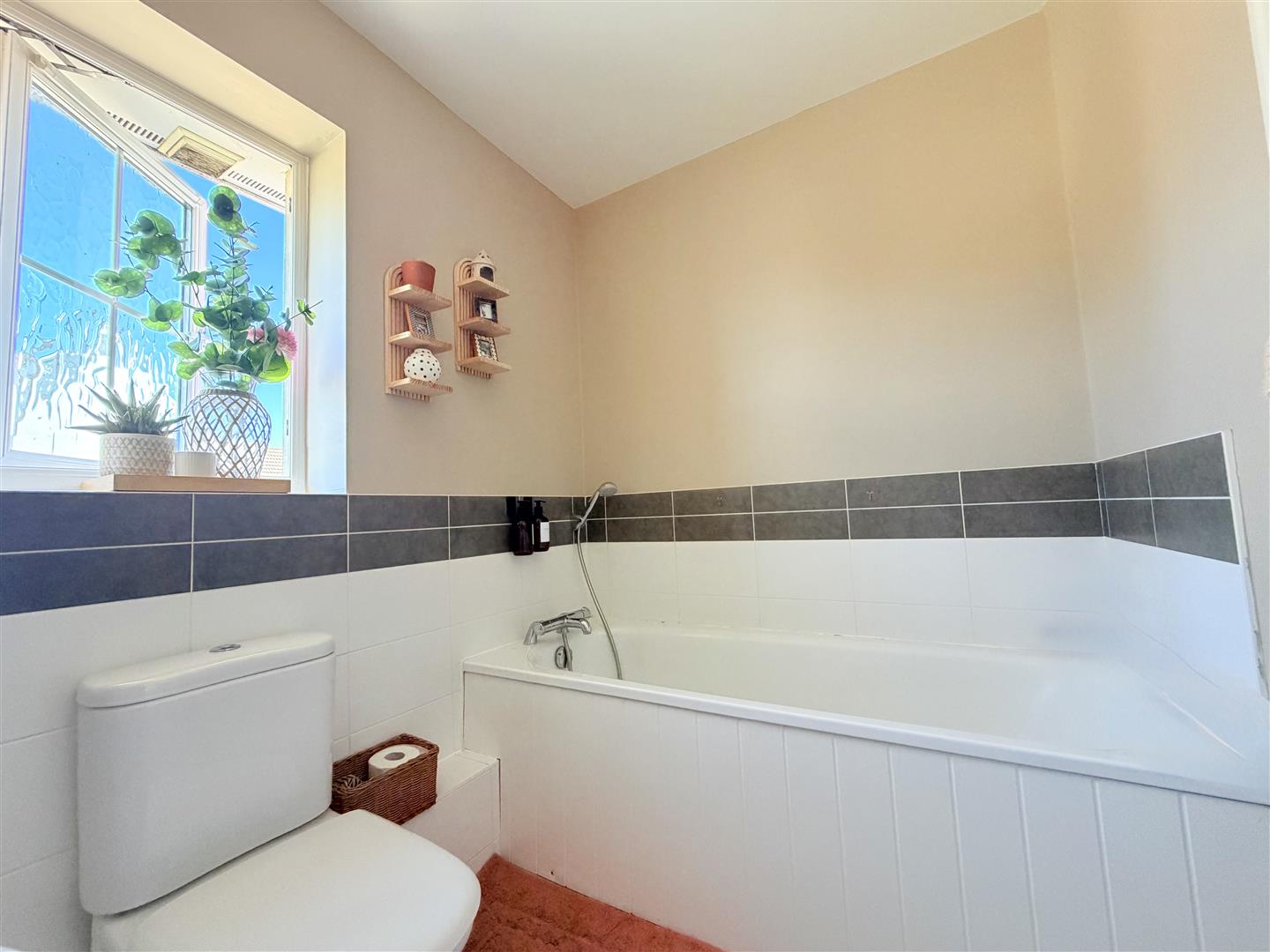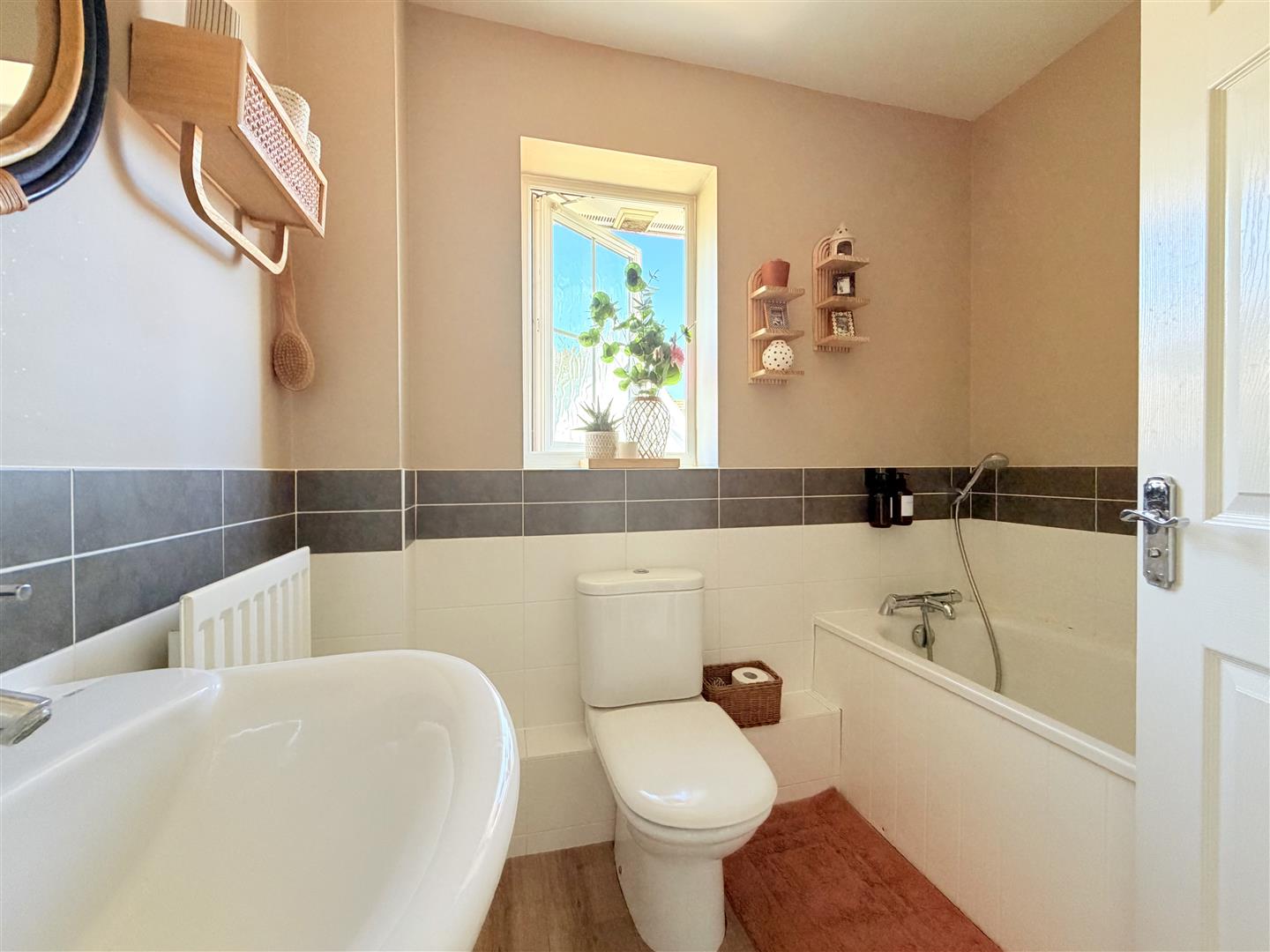 Fitted with a white suite including an enamel bath with mixer shower attachment, low-level WC, and pedestal wash hand basin. Complemented by tiled splashbacks, wood-effect vinyl flooring, shaver point, radiator, and a frosted UPVC window to the front.