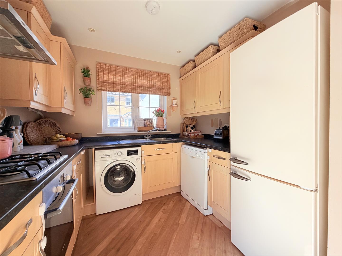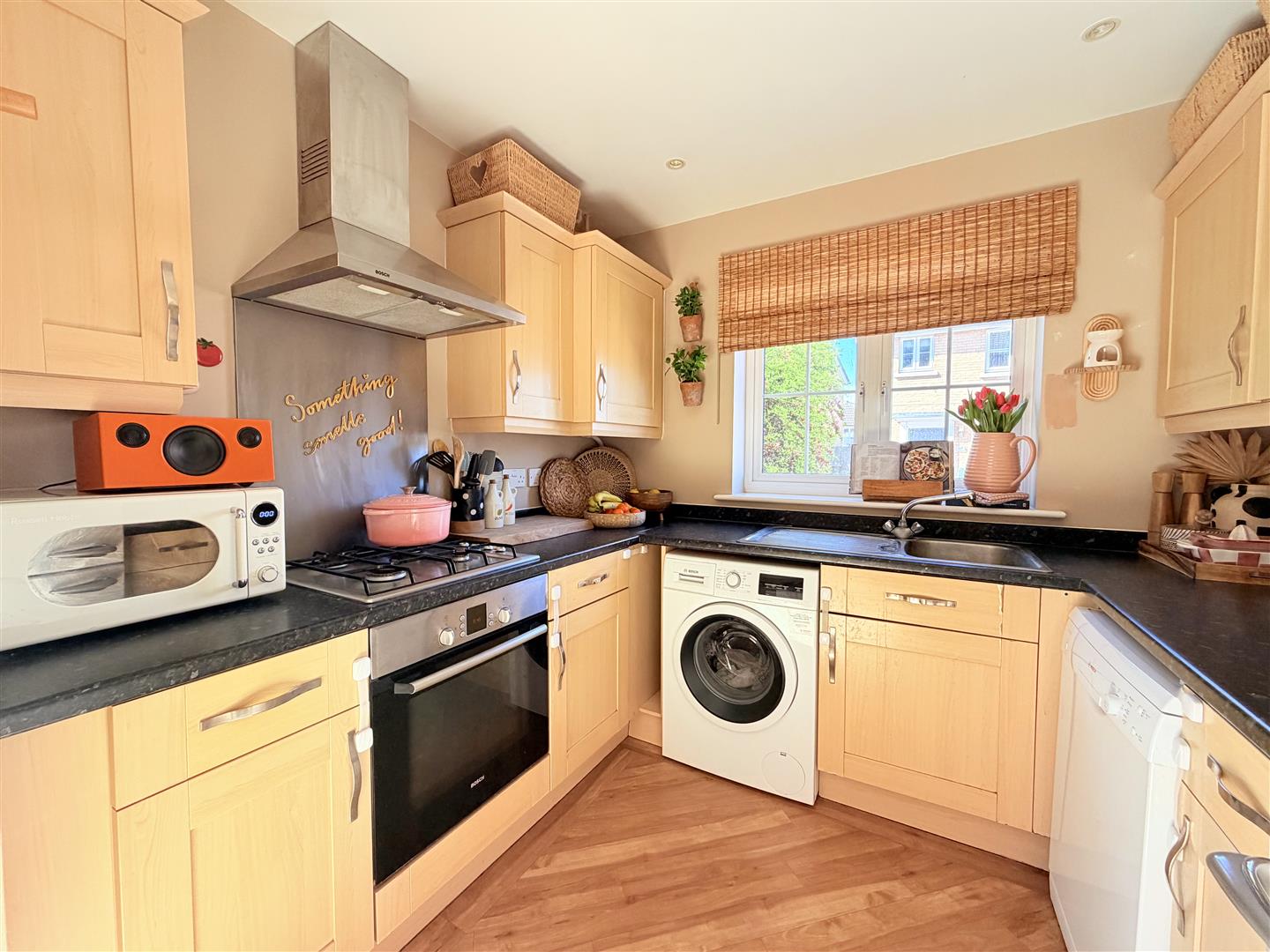 Fitted with a range of Shaker-style wall and base units with complementary work surfaces and upstands. Incorporates an inset stainless steel sink with mixer tap, Bosch gas hob with stainless steel splashback and extractor canopy, and a built-in Bosch electric oven/grill. Additional space and plumbing for a dishwasher, washing machine, and fridge/freezer. Cupboard housing a wall-mounted gas boiler, wood-effect vinyl flooring, downlighting, and a front-facing UPVC window.